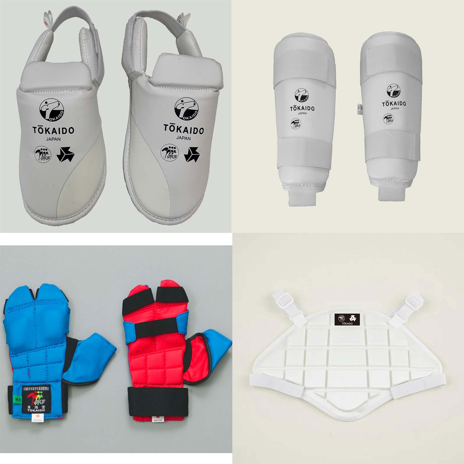 リバーシブル拳サポーター、JKF公認ボディプロテクター、全空連/高体連公認 軽量型インステップガード、全空連/高体連公認 軽量型シンガード