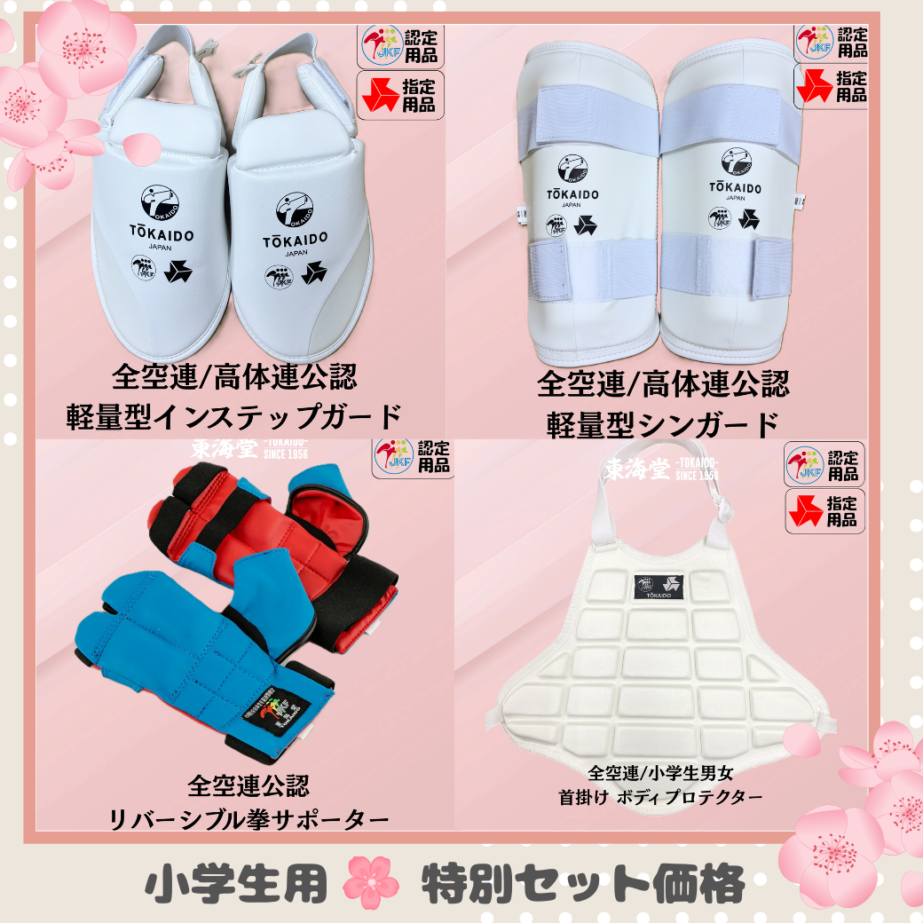 スタートアップキャンペーン防具セット(リバーシブル拳サポーター、インステップガード、シンガード、JKF首掛けボディプロテクター)